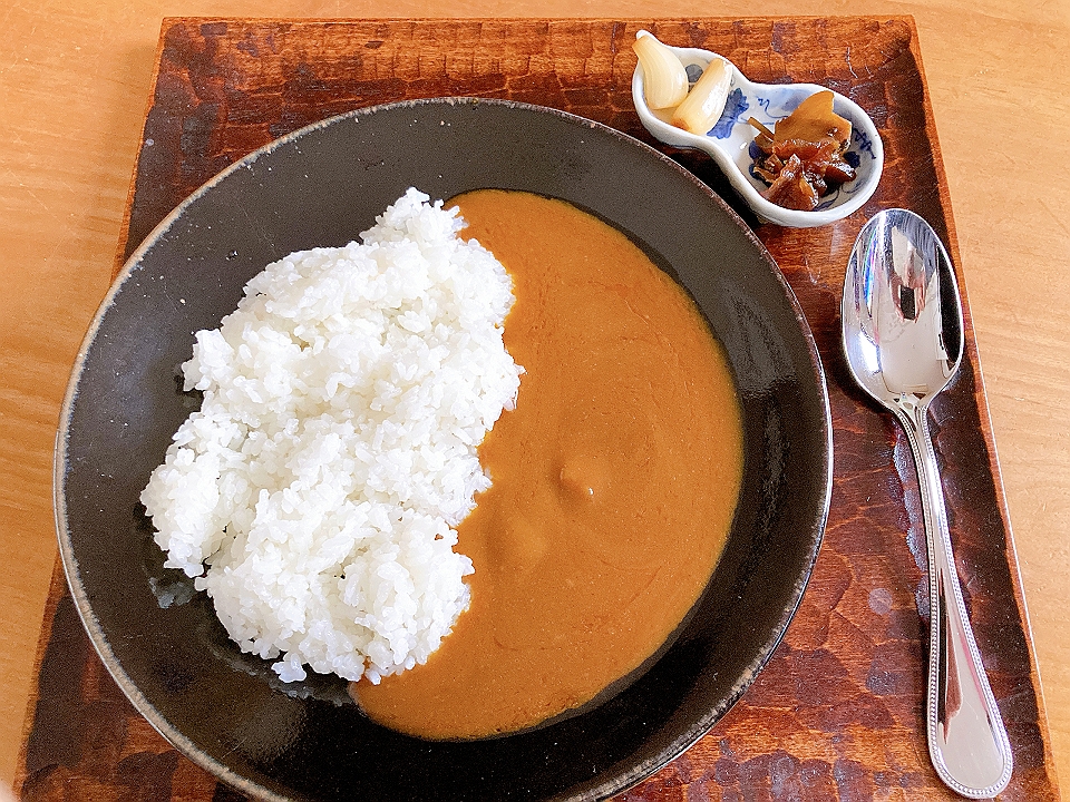 朝飯 カレーライス、らっきょうのたまり漬「小つぶちゃん」、たまり漬「七種きざみあわせ・だんらん」
