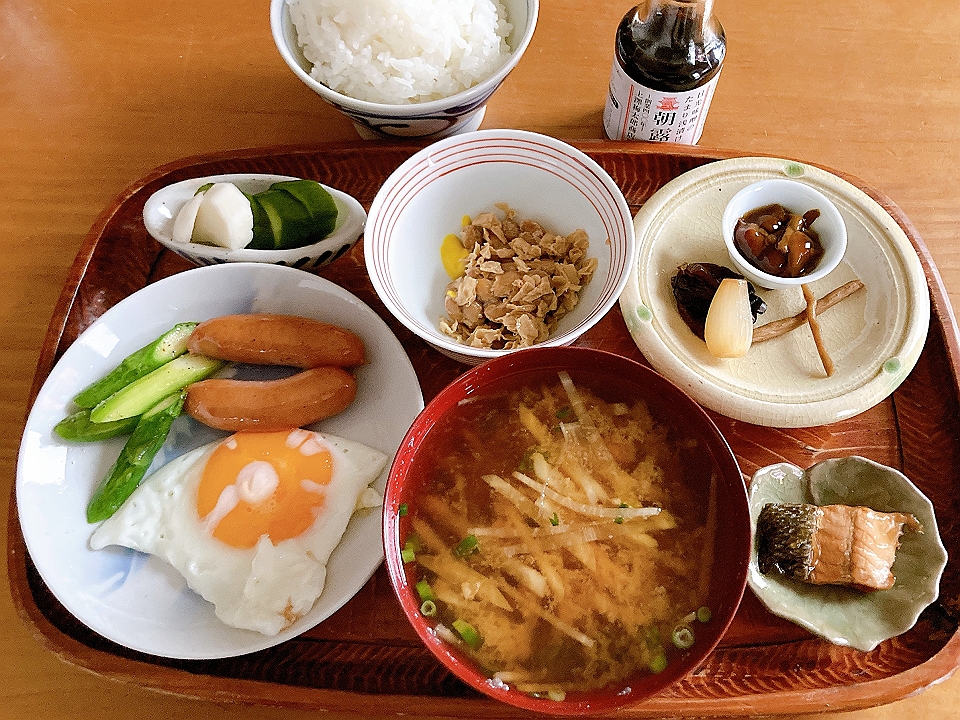 朝飯 グリーンアスパラガスとウインナーソーセージのソテーを添えた目玉焼き、納豆、鮭の焼き漬け、胡瓜と蕪のぬか漬け、なめこのたまり炊、たまり漬「七種きざみあわせ・だんらん」、らっきょうのたまり漬「小つぶちゃん」、ごぼうのたまり漬、メシ、大根と万能葱の味噌汁