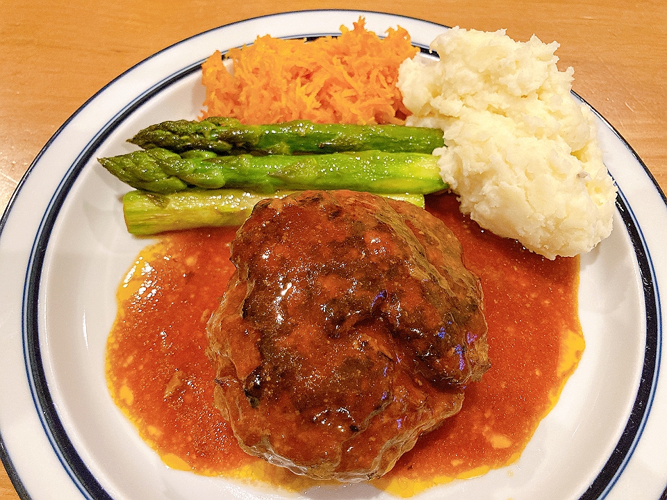 晩飯 レタスとベビーリーフのサラダキャロットラペとグリーンアスパラガスのソテーとマッシュドポテトを添えたハンバーグステーキCono Sur Bicicleta Reserva Cabernet Sauvignon 2018