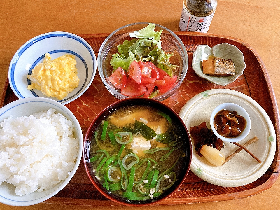 朝飯 スクランブルドエッグ、トマトとレタスのサラダ、鮭の焼き漬け、なめこのたまり炊、たまり漬「七種きざみあわせ・だんらん」、らっきょうのたまり漬「小つぶちゃん」、ごぼうのたまり漬、メシ、豆腐と若布と長葱の味噌汁