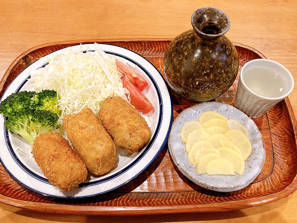 晩飯 茹でたブロッコリーと刻みキャベツと生のトマトを添えたコロッケ、沢庵、「齋彌酒造店」の「雪の茅舎山廃純米」(燗)