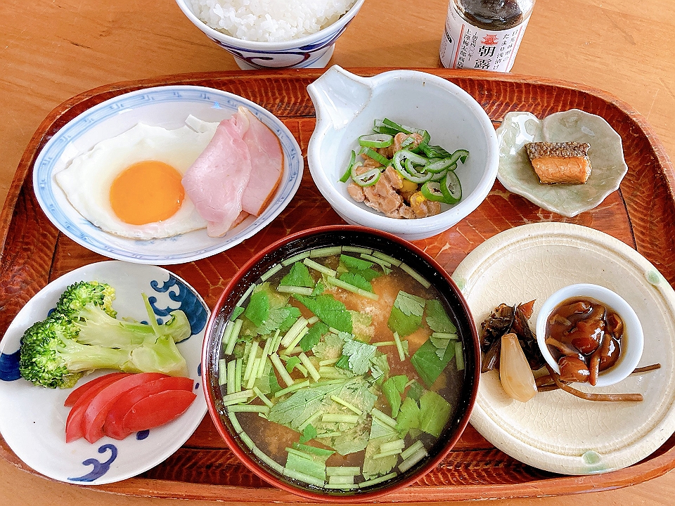 朝飯 茹でたブロッコリーと生のトマト、ハムエッグ、納豆、鮭の焼き漬け、なめこのたまり炊、たまり漬「七種きざみあわせ・だんらん」、らっきょうのたまり漬「小つぶちゃん」、ごぼうのたまり漬、メシ、豆腐と三つ葉の味噌汁