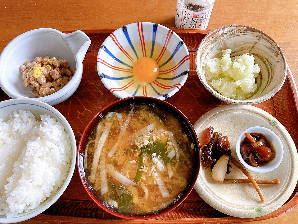 朝飯 キャベツのソテーを添えた目玉焼き、納豆、鮭の昆布巻、なめこのたまり炊、たまり漬「七種きざみあわせ・だんらん」、らっきょうのたまり漬「小つぶちゃん」、ごぼうのたまり漬、メシ、大根と若布の味噌汁