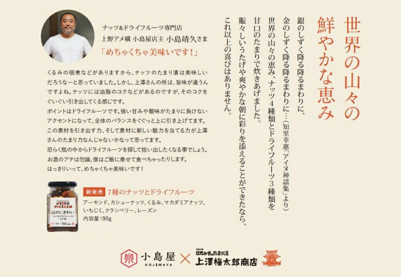 この味との出会いは、一生もの なめこのたまり炊 ¥ 1,100 税込 国産の大粒を厳冬仕込みした、シャキシャキの歯切れ。引き締まった辛口は、大根おろしに合う。数十年来、店主が愛する上澤の味。 カートに入れる お気に入りに登録する