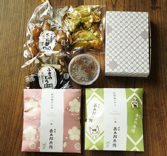 こちらの甚五郎煎餅を食べきりサイズにしたのがこちらです。「伝統塩バター」は、甚五郎煎餅ファンにはおなじみの塩味。南高梅ざらめは、梅の香りのざらめ煎餅です。