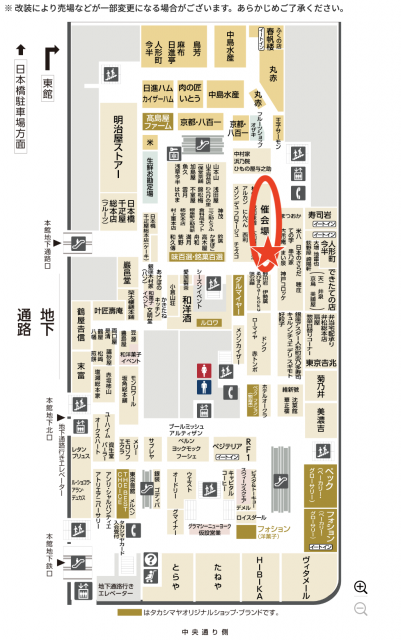 東京メトロ日本橋駅”B4″出口から降りますと、高島屋さんの地下鉄側出入口の目の前に出てまいります。