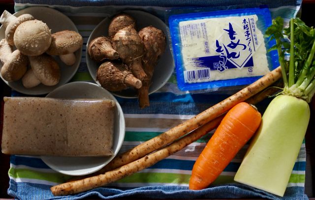 だいこん、にんじん、ごぼう、さといも、しいたけ、こんにゃく、とうふ(木綿)。