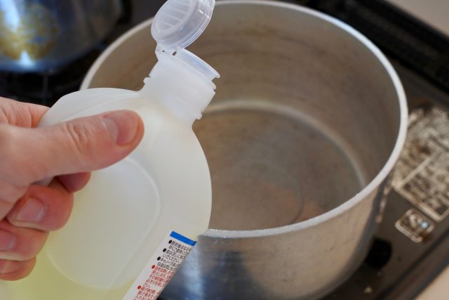 火にかけて油がやわらかくなったら、鍋の底に油が回るていどを目安としてください。
