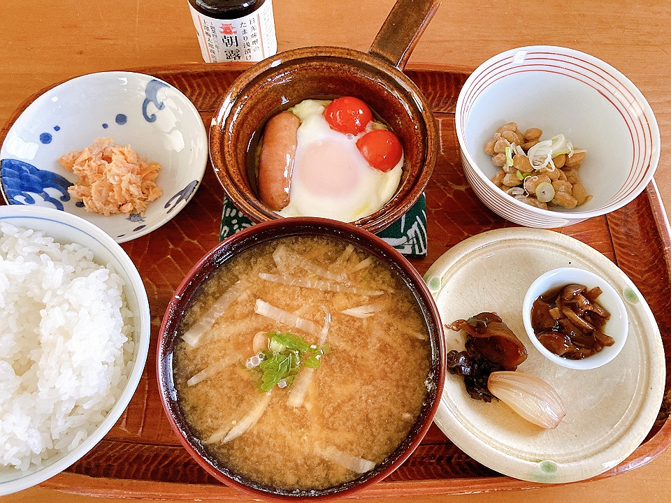 朝飯 目玉焼き、納豆、菠薐草のおひたし、鮭の焼きほぐし、なめこのたまり炊、たまり漬「七種きざみあわせ・だんらん」、らっきょうのたまり漬「つぶより」(四つ割り)、ごぼうのたまり漬、メシ、トマトと揚げ湯波と若布の味噌汁