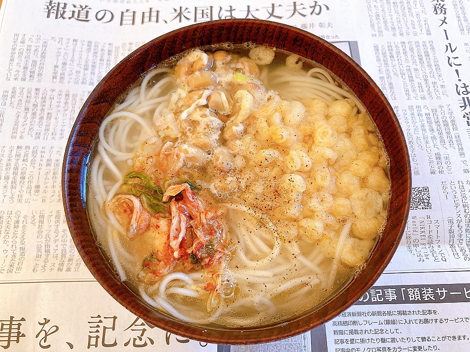 朝飯 生玉子、冷や奴、納豆、なめこのたまり炊、たまり漬「七種きざみあわせ・だんらん」、らっきょうのたまり漬「つぶより」(四つ割り)、ごぼうのたまり漬、メシ、揚げ湯波と長葱の味噌汁