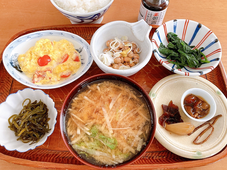 朝飯 トマトのスクランブルドエッグ、納豆、菠薐草のソテー、切り昆布の炒り煮、なめこのたまり炊、たまり漬「七種きざみあわせ・だんらん」、らっきょうのたまり漬「つぶより」(四つ割り)、ごぼうのたまり漬、メシ、大根とレタスの味噌汁