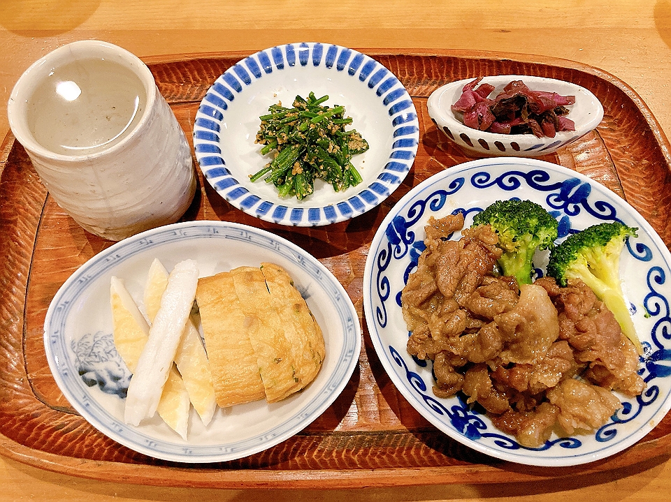 晩飯 菠薐草の胡麻和え、三種の蒲鉾、茹でたブロッコリーを添えた豚の生姜焼き、柴漬け、麦焼酎「こいむぎやわらか」(お湯割り)