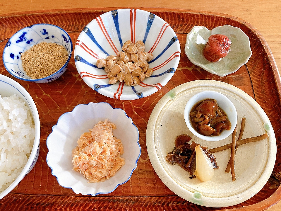 朝飯 擂り胡麻、納豆、梅干、ほぐし塩鮭、なめこのたまり炊、たまり漬「七種きざみあわせ・だんらん」、らっきょうのたまり漬「小つぶちゃん」、ごぼうのたまり漬のお茶漬け