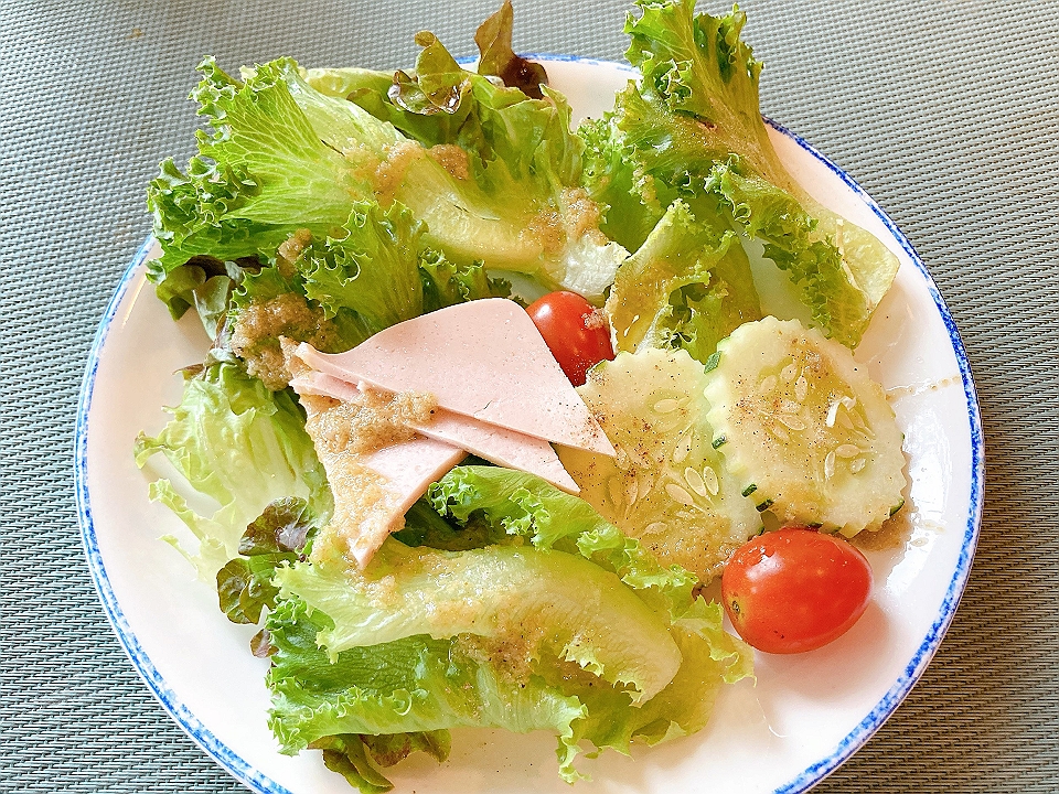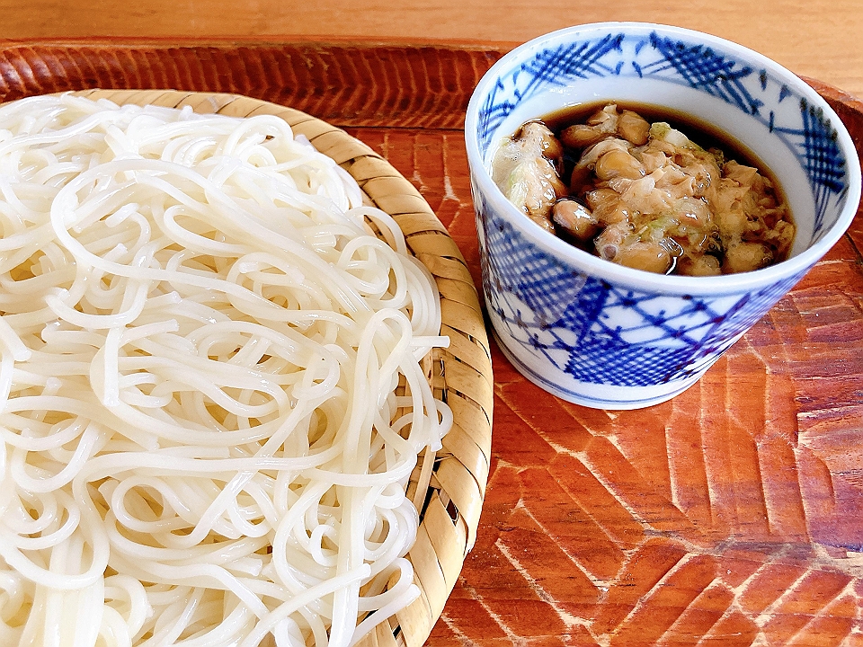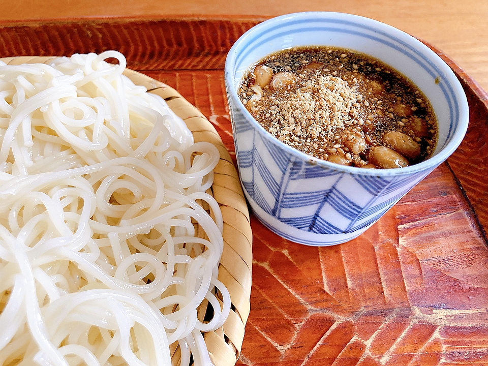 昼飯 納豆と擂り胡麻のつゆで食べる素麺