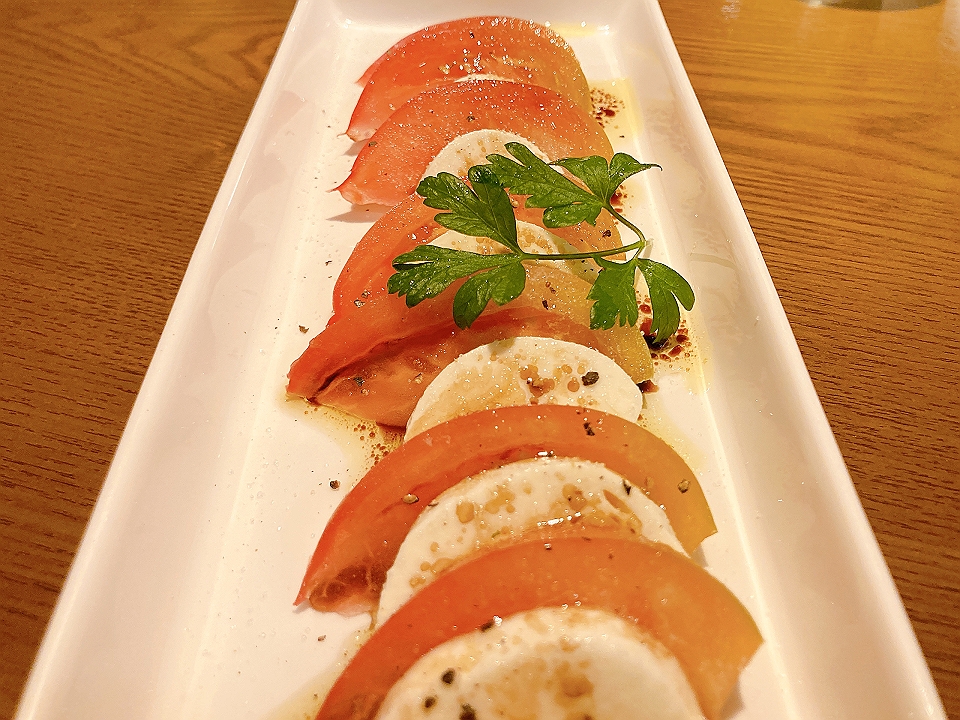 晩飯 「コスモス」のトマトとモッツァレラチーズのサラダ、コンビネーションサラダ、ドリア、ハイボール、TIO PEPE