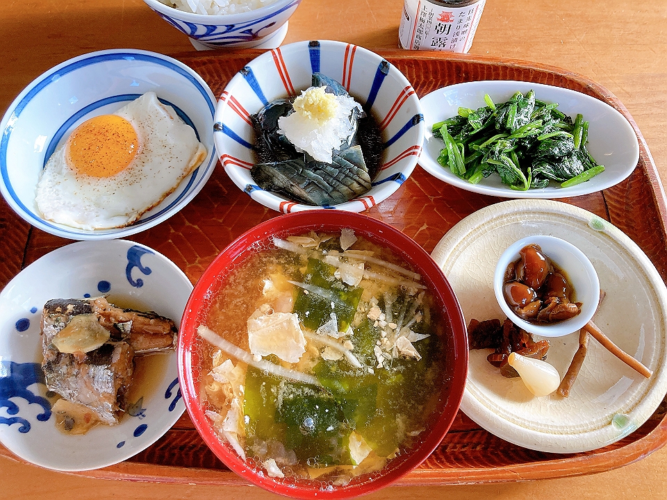 朝飯 秋刀魚の梅煮、目玉焼き、茄子の揚げびたし、菠薐草のソテー、なめこのたまり炊、たまり漬「七種きざみあわせ・だんらん」、らっきょうのたまり漬「小つぶちゃん」、ごぼうのたまり漬、メシ、大根と若布と揚げ湯波の味噌汁