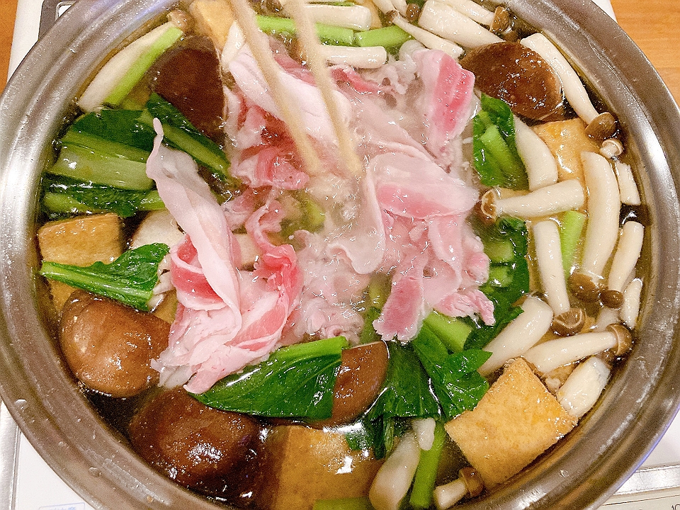 晩飯 豚薄切り肉と小松菜と厚揚げ豆腐ときのこの鍋、らっきょうのたまり漬「小つぶちゃん」、たまり漬「七種きざみあわせ・だんらん」、麦焼酎「こいむぎやわらか」(お湯割り)、「本沢屋」の団子、Old Parr(生)