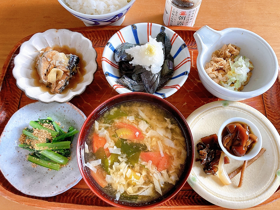 朝飯 小松菜のおひたし、秋刀魚の梅煮、茄子の揚げびたし、納豆、なめこのたまり炊、たまり漬「七種きざみあわせ・だんらん」、らっきょうのたまり漬「小つぶちゃん」、ごぼうのたまり漬、メシ、トマトとキャベツと若布と揚げ湯波の味噌汁
