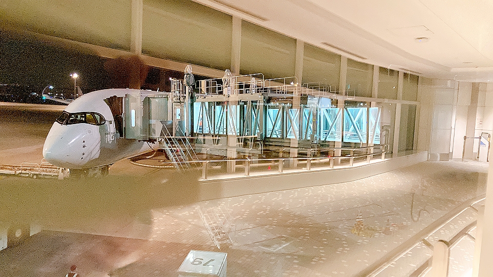 06:35 冷蔵庫のように冷えたバスで沖まで運ばれ、飛行機のタラップを上がる。