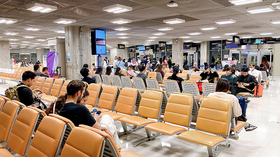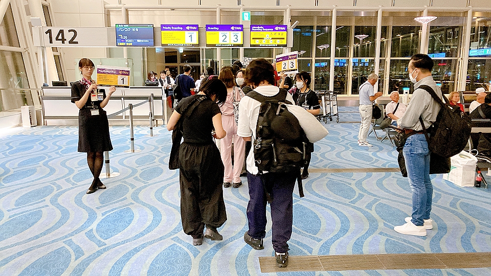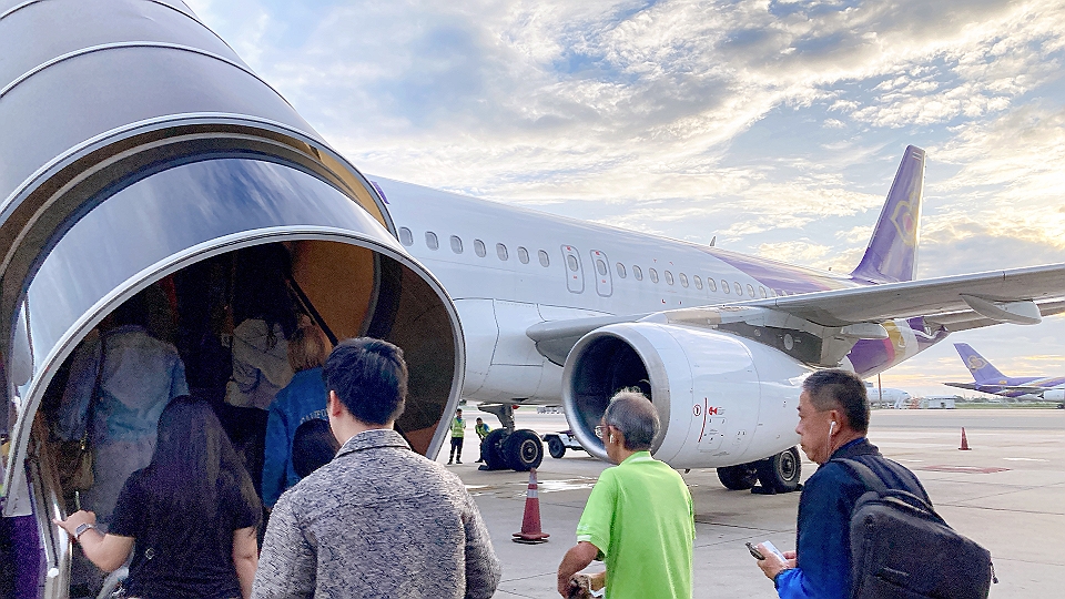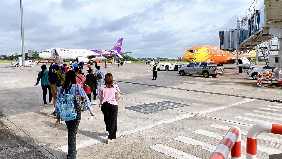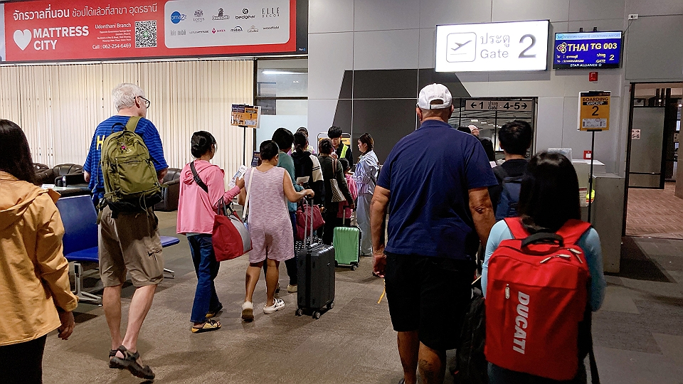 08:08 気配を感じて振り向くと、搭乗券には搭乗ゲートが「1」と示されているにもかかわらず、2番ゲートから搭乗が始まっている。タイの地方空港では良くあることだ。