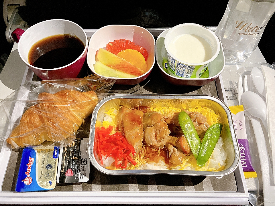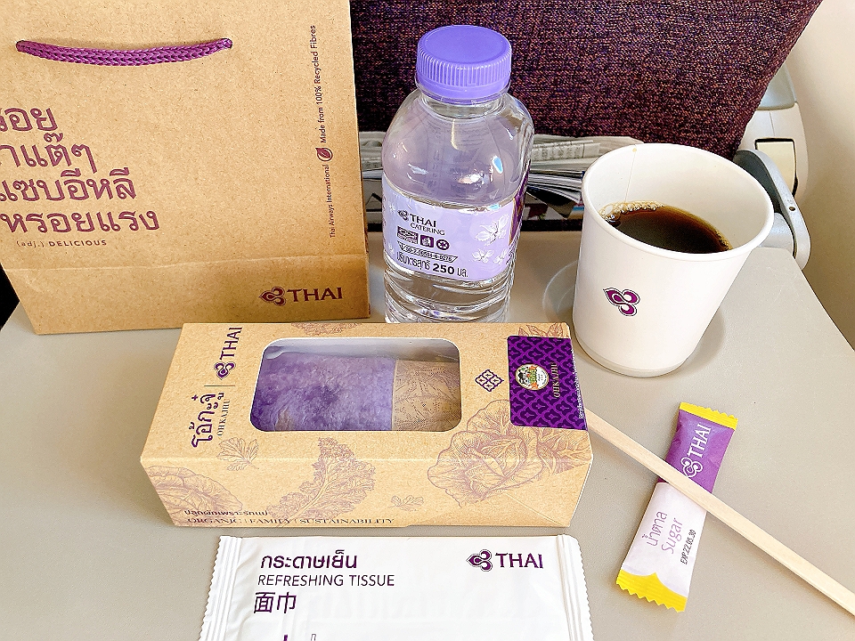 朝飯 TG003の機内で配られたミルクティー味のあんこの大福、コーヒー