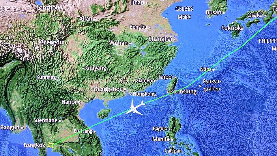 09:15 「バンコクまで15分」の機長によるアナウンスが流れて「え、そんなに早く?」と驚く。