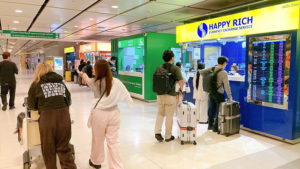 05:05 出発階の四階から地下一階にはエレベータで降りる。空港と街を結ぶ鉄道ARLの乗り場ちかくに開いていた両替所は4ヶ所。交換率はどこも同じにて、もっとも空いていたカシコン銀行のブースで10万円を21,450バーツに換える。