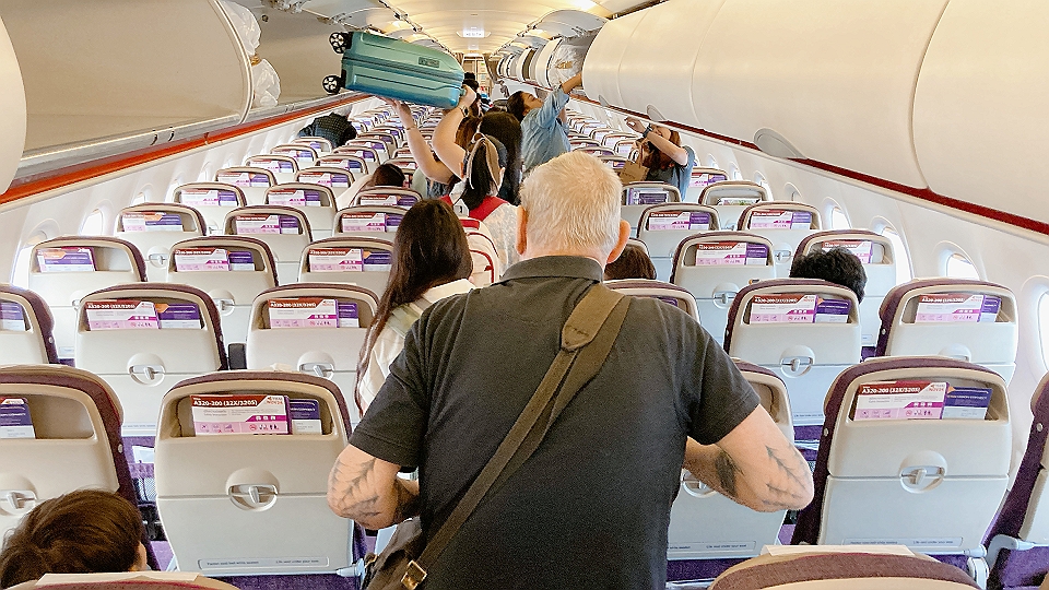 ところでこの便の、全156席のうち埋まっているのは5分の1ほど。それだけ空いているにも関わらず、右列最後部のひと席となりには、B8ゲートにいるときから怪しげな咳をし続けていた、服装や持ち物からすれば沈没組と思われるファランが座った。