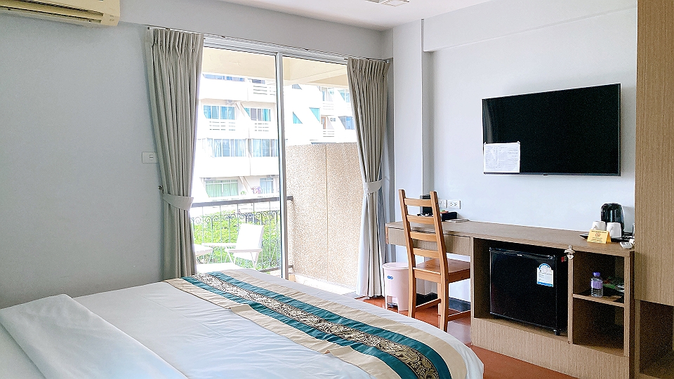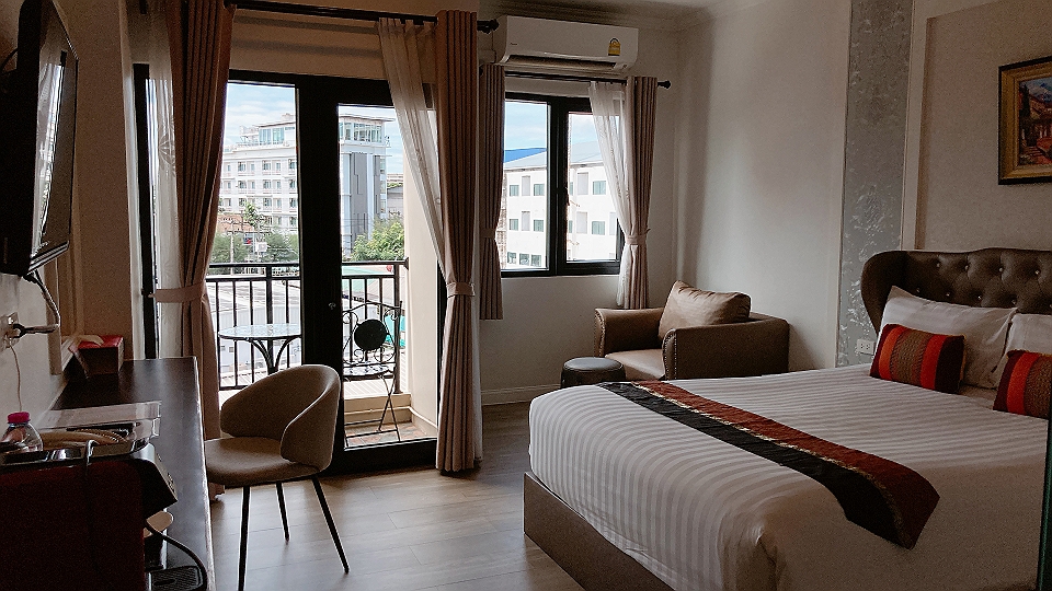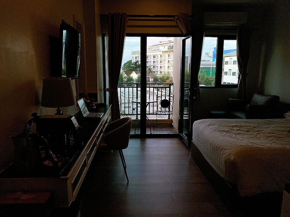 小さなエレベータを5階まで使って部屋に入る。ベランダ付きのデラックスルームではあるものの、部屋の広さや年季の入った様子からすれば、せいぜい1,000バーツクラスの部屋だ。その2.5倍の実料金は、場所の良さや需要によるものだろう。そして僕はこのような、街の真ん中にある古くて小さなホテルが嫌いではない。