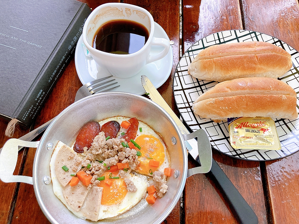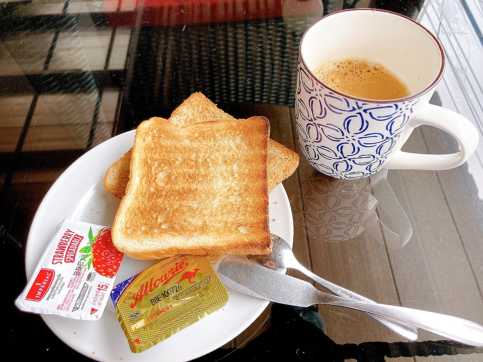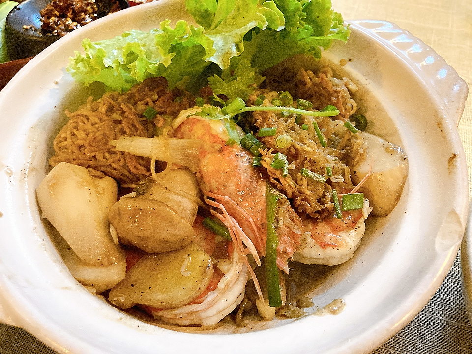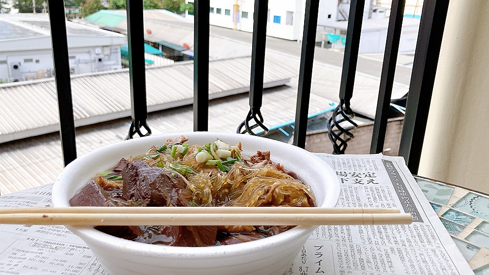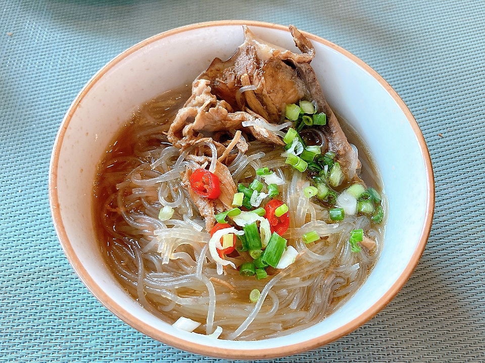 今日の朝食はホテルで摂る。サラダとオムレツ、トーストとコーヒーでひと息をついてから、他の料理を見ていく。すると幾つも並んだポットの中に”Udon Vermicelli Soup”と札の立てられたものがあった。フタを開けてみれば、きのう屋台のオバサンから買ったとおなじ春雨と鶏肉のスープではないか。即、ちかくに積み上げられている陶製のボウルにこれを取り分け、席へ運んだことは言うまでもない。