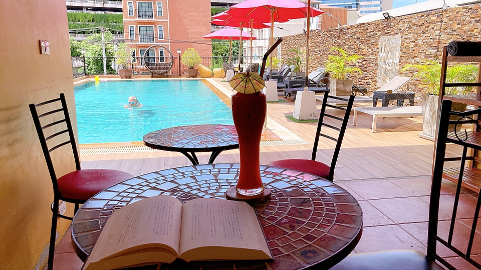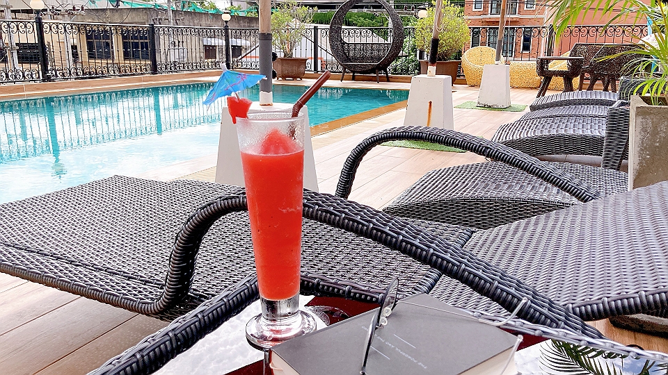 15時より二階のプールサイドで本を読む。日が徐々に傾いても日除けのパラソルは複数あるから、寝椅子を移れば問題は無い。明日はプールサイドのバーで、愛想の良いオネーサンに飲み物を頼んでみることにしよう。