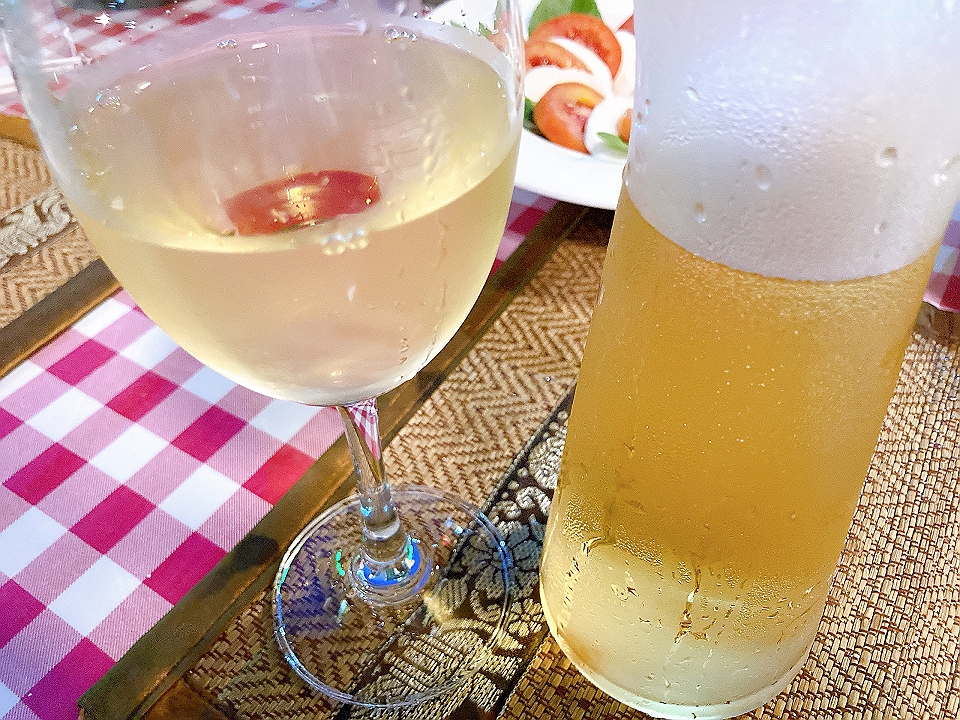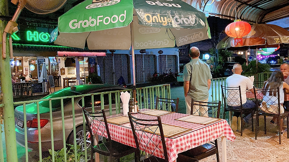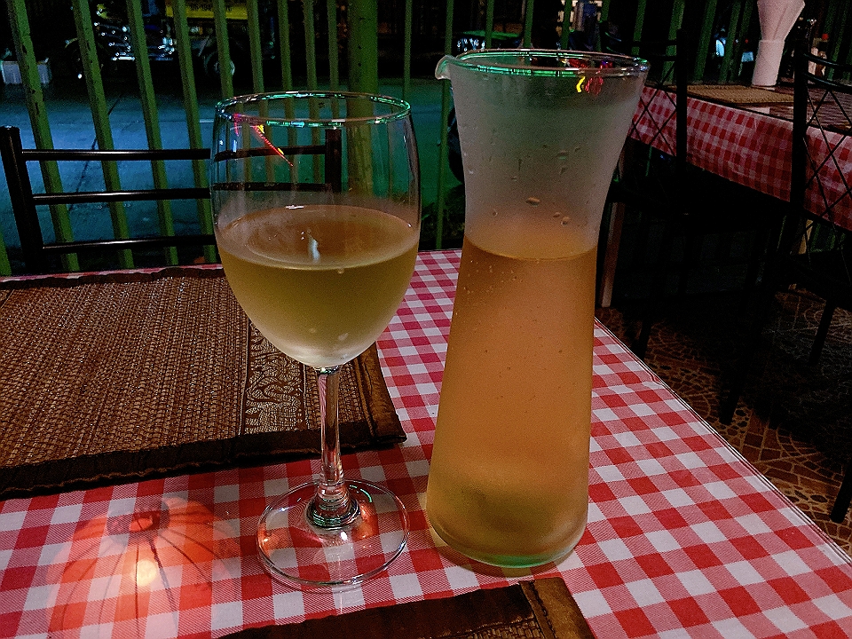 外の二人用のテーブルには、ヒマをかこつウエートレスが座っていた。その席を譲ってもらって先ずはおとといとおなじカラフの白ワインを注文する。それを確かめるオネーサンの”White?”は「ワイ」が強く発声された。タイ人の英語の発音は、日本人のそれにくらべておしなべて良い。「流石ですね」である。