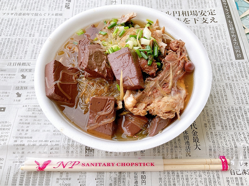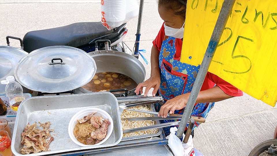 屋台に近づいて、オバサンに20バーツ札1枚と10バーツ硬貨ひとつを手渡す。オバサンは「これも入れるか」とモヤシを指すので「チャイ」と答える。するとオバサンはそのモヤシをビニール袋に入れ始めたので、あわてて屋台の屋根からぶら下げた袋の中の、発泡スチロール製のドンブリを指す。オバサンは「あぁ」と答えてそのドンブリを袋からひとつ取りだし、そこにスープを盛大に盛り始めた。