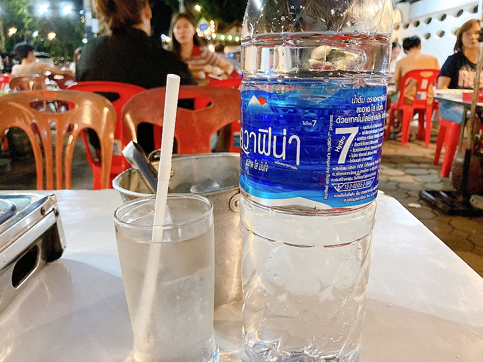 そのマッサージ屋から歩いて一分の、初日にも来たホイトードの、初日と同じ席に着く。おとといの夜とは異なって、今日はタイ航空のペットボトルに小分けしたラオカーオを忘れずに持参した。初日に「センタン」のトップスマーケットで買ったラオカーオは、愛飲の”BANGYIKHAN”にくらべればかなり強く口腔内を刺激するものの、不味いということはない。