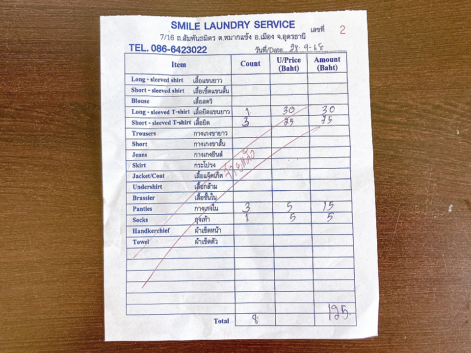 ホテルからは目と鼻の先の、2020年3月にも頼んだことのある洗濯屋は8時30分に、もう仕事を始めていた。今朝は三人いるうちのひとりのオネーサンに、プラスティック袋を手渡す。オネーサンはその中味をひとつずつ取り出しながら、複写式の伝票を作ってくれた。一点ごとの洗濯代は、ハイネックの長袖シャツが30バーツ、半袖のTシャツは25バーツ、下着のパンツは5バーツ、靴下も5バーツで、計125バーツをオネーサンに支払う。できあがりは明日の17時とのことだった。