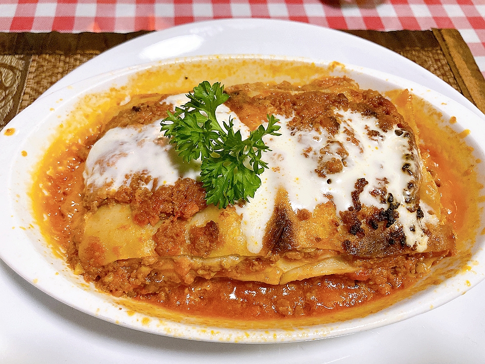 晩飯 “da Sofia”のラザニアアラボロネーゼ、カラフの白ワイン