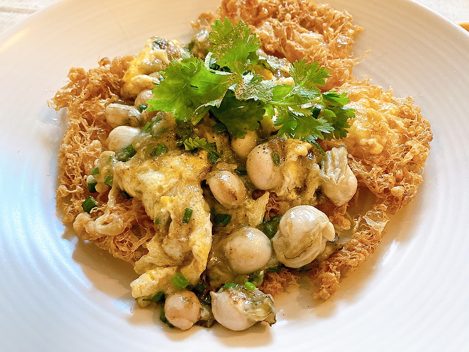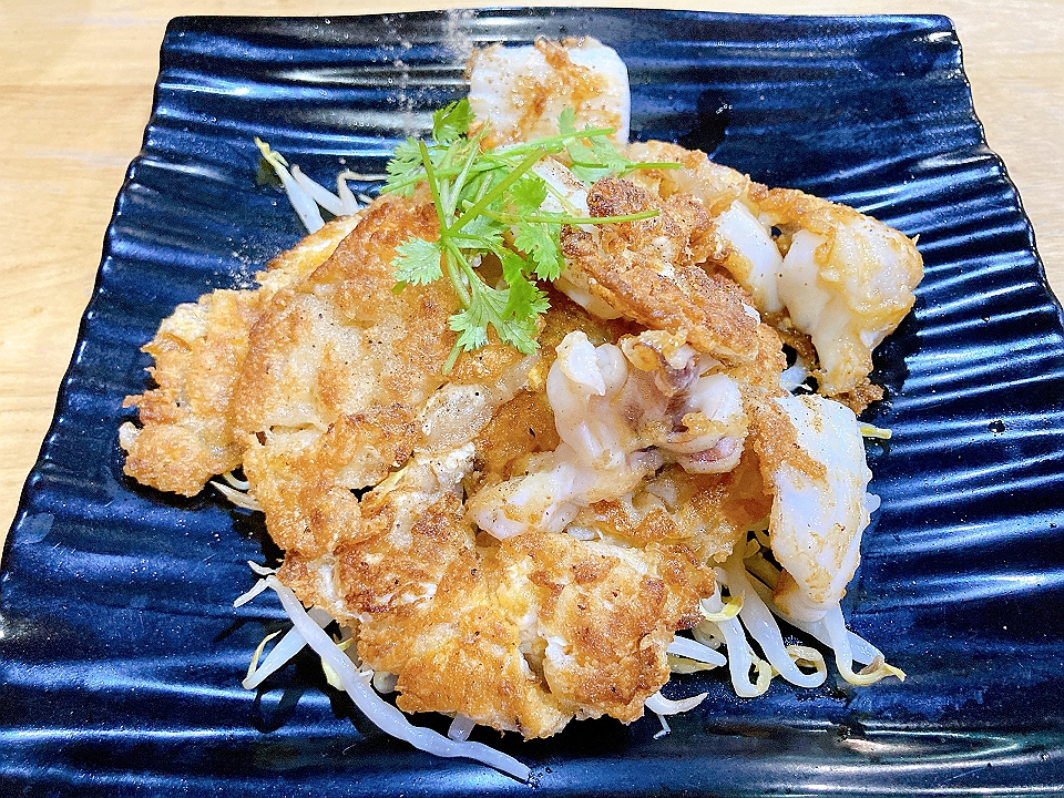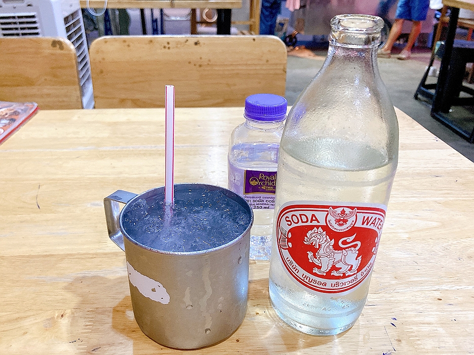 晩飯 “Je Huay Hoi Tod”の烏賊と海老とムール貝と牡蠣のトード、ラオカーオ”BANGYIKHAN”(ソーダ割り)