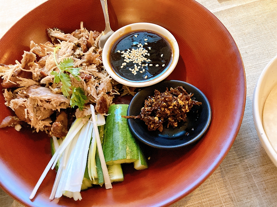 晩飯 “ROD TIEW”の蒸し鶏、オースワン、クラゲの四川風、家鴨のほぐし肉の北京ダック風、麻婆豆腐、クンオップバミー、サントリージン翠(ソーダ割り)