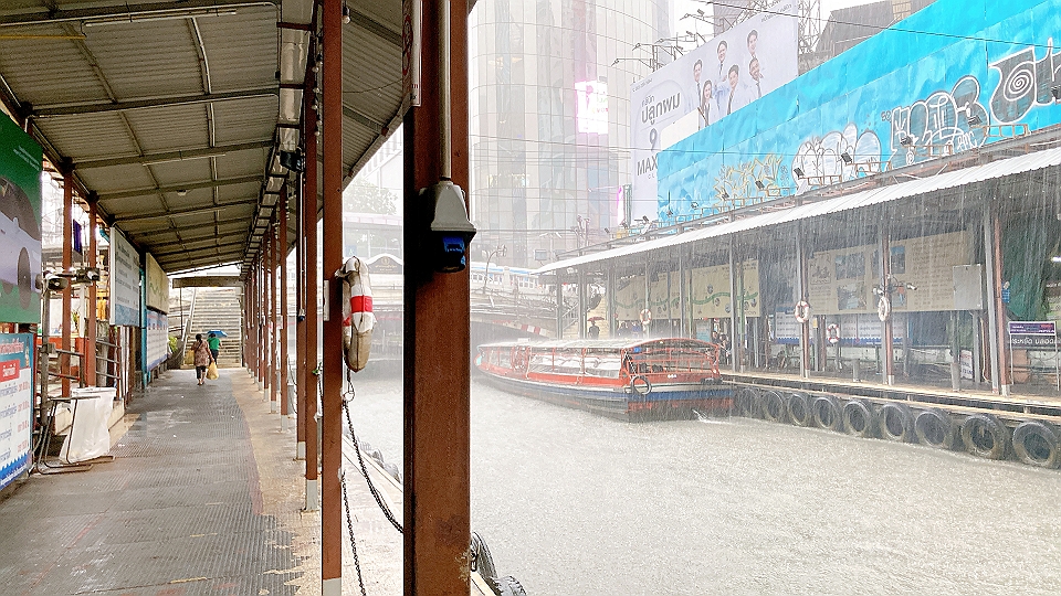 そのまま為す術もなく終点のパンファーリーラードまで行く。強さを増した雨は船着場のベンチを後ろ側から襲い、遂には僕も席を立つ。頭上には「タバコを吸ったら5,000バーツの罰金」の看板が提げられているものの、タバコの強い香りがする。周りを見まわすと、僕のすぐ脇にいる白人の指に吸いさしのタバコが挟まれていた。看板が目に入らないのだろうか、あるいは「どうせ何も言われはしない」と、高を括っているのだろうか。