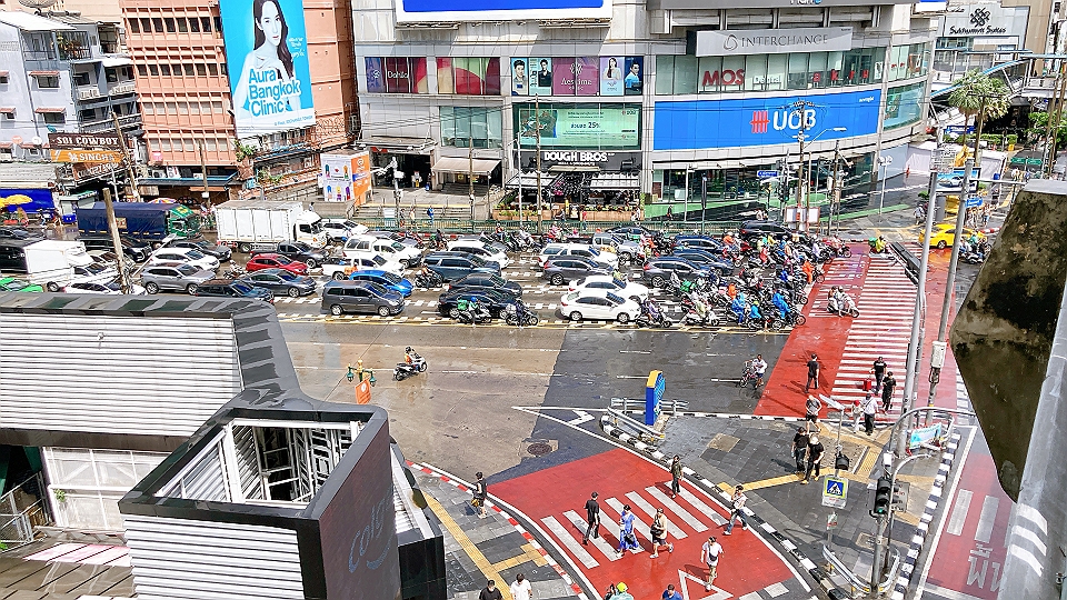 iPhoneのGoogleマップによりアソークが近いことを知って席を立とうとする。その僕を「危ないから」と、先ほどのオバサンが手で制する。アソークで舟を下りると、雨は弱くなっていた。そのまま100メートルほどを早足で歩いて地下鉄MRTのペッブリーに逃げ込む。そこからスクムビットまではひと駅。地下を歩けば高架鉄道BTSのアソーク。雨は上がって、人たちはアソークの大きな交差点を、なにごともなく渡っている。「ダッフンダ」である。
