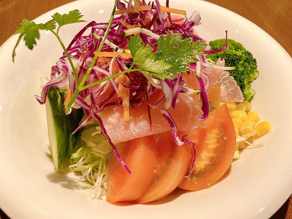 晩飯 “THE FLYING-GARDEN”のクレソンサラダ、ハンバーグドリア、カラフの赤ワイン