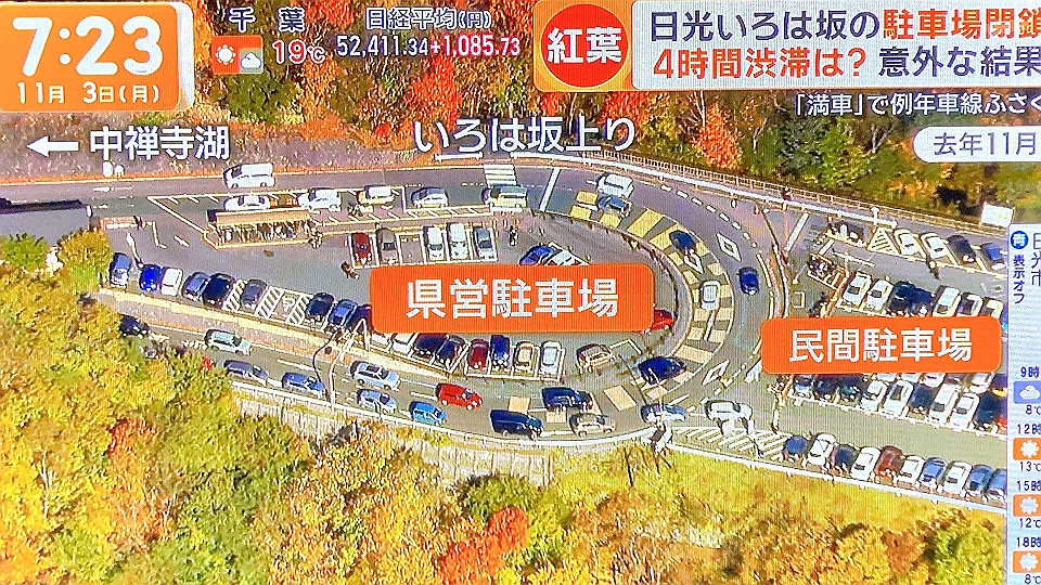 11日1日からの三連休に閉鎖される「いろは坂付近の県営駐車場」とは、上りのいろは坂の途中にある明智平の駐車場のことだった。報道によれば、この閉鎖によって、これまで最大で4時間を要した9.5キロメートルの所要時間が大幅に短縮できたとのことだった。