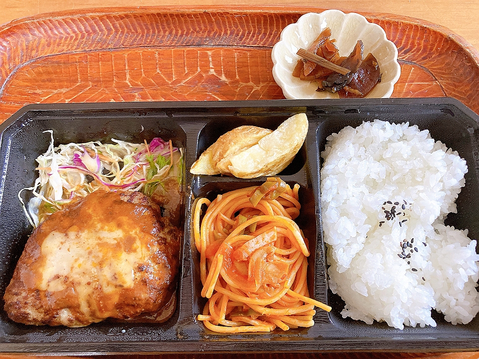 昼飯 会社支給の「コスモス」の「ハンバーグデミグラチーズ弁当」、たまり漬「七種きざみあわせ・だんらん」
