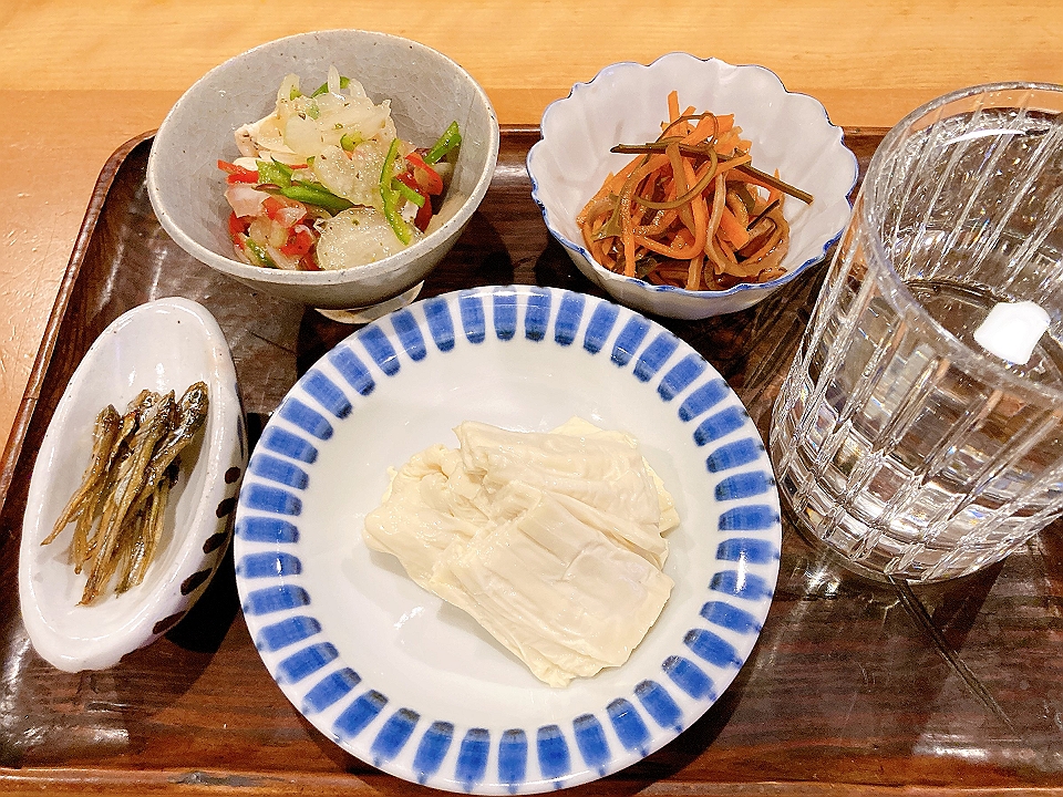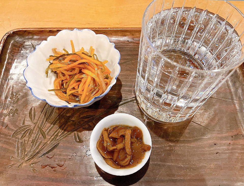 晩飯 ごまめの甘露煮、蛸のマリネ、松前漬け、刺身湯波、牛蒡と人参と三つ葉の精進揚げ、盛り蕎麦、「本田商店」の「龍力米のささやき奥谷純米大吟醸」(冷や)
