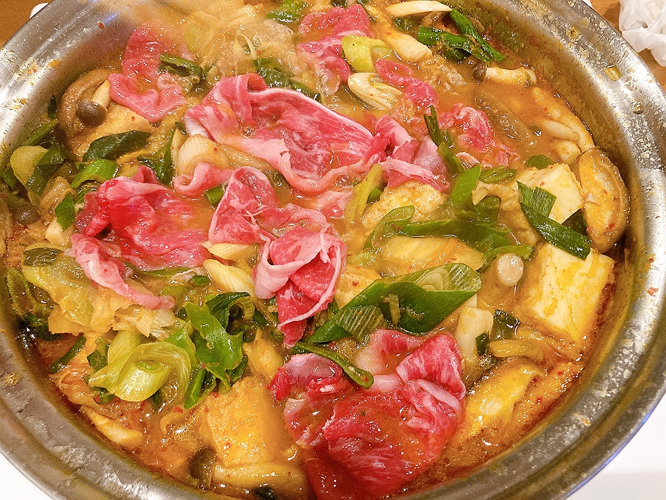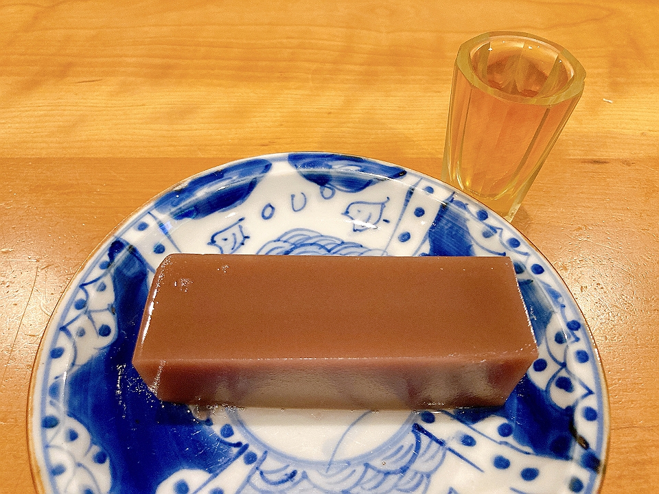 晩飯 松前漬け、なめこのたまり炊、麦焼酎「むぎっちょ」(お湯割り)、豚キムチ鍋、「本田商店」の「龍力米のささやき奥谷純米大吟醸」(冷や)、「久埜」の水羊羹、Old Parr(生)