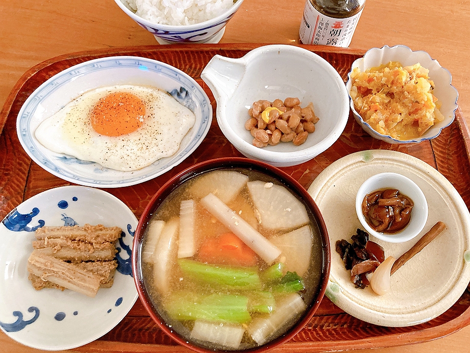 朝飯 たたきごぼう、目玉焼き、納豆、しもつかり、なめこのたまり炊、たまり漬「七種きざみあわせ・だんらん」、らっきょうのたまり漬「小つぶちゃん」、ごぼうのたまり漬、メシ、大根と人参と牛蒡と小松菜の味噌汁