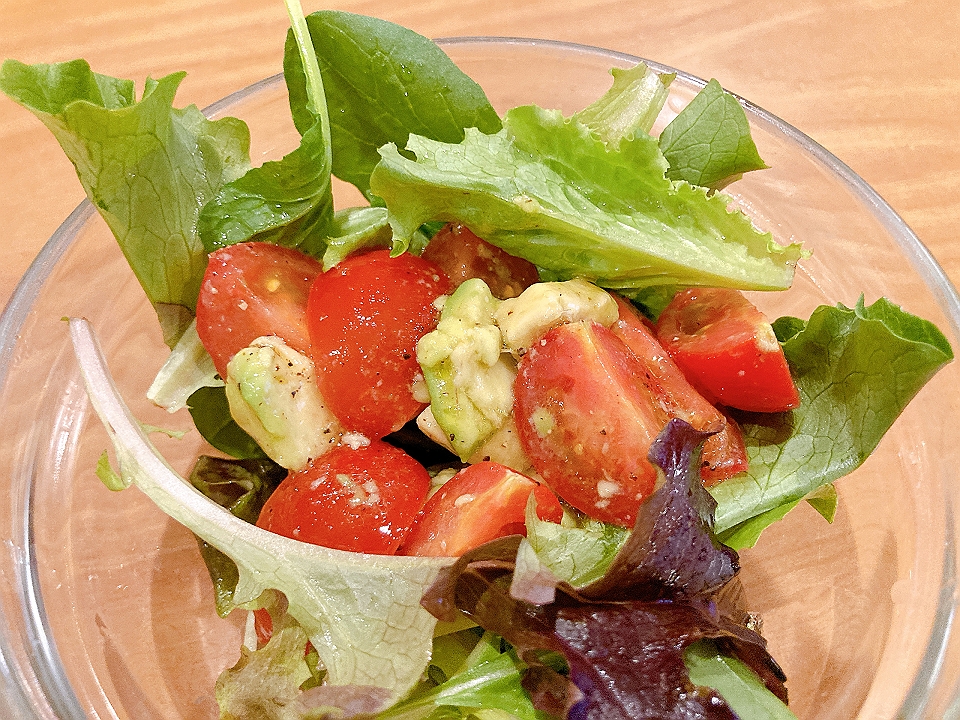 晩飯 「コスモス」のトマトとモッツァレラチーズのサラダ、具だくさんのサラダ、海老ドリア、サントリー角(お湯割り)