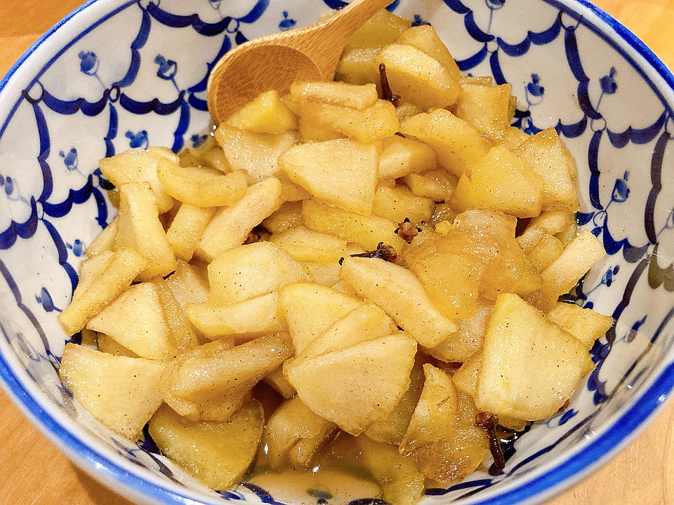 晩飯 かまぼこ、なめこのたまり炊、カレー南蛮鍋、「本田商店」の「龍力米のささやき奥谷純米大吟醸」(燗)、りんご