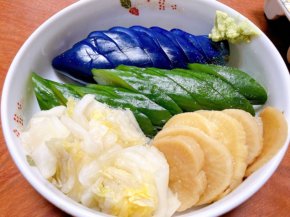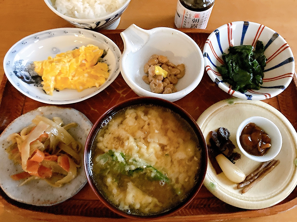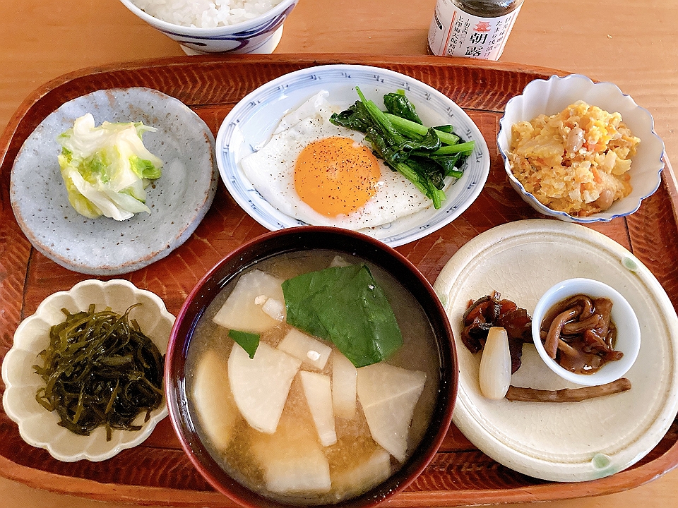 朝飯 切り昆布の炒り煮、白菜漬け、菠薐草のソテーを添えた目玉焼き、しもつかり、なめこのたまり炊、たまり漬「七種きざみあわせ・だんらん」、らっきょうのたまり漬「小つぶちゃん」、ごぼうのたまり漬、メシ、大根と菠薐草の味噌汁