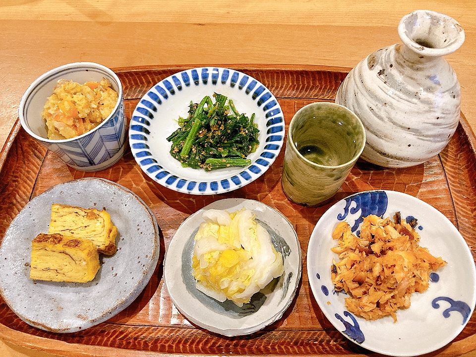 晩飯 玉子焼き、しもつかり、菠薐草の胡麻和え、鮭の「日光味噌梅太郎白味噌」漬け焼きほぐし、白菜漬け、筑前煮、豚挽き肉と春雨の胡麻油炒め、「本田商店」の「龍力米のささやき奥谷純米大吟醸」(燗)